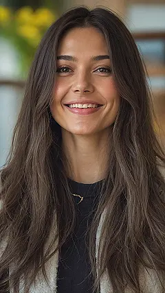 Look at that amazing smile! It’s almost as cheerful as the way her long hair perfectly cascades down, thanks to those fantastic layers. Layers are like your hair’s personal hype squad, preventing it from just hanging there flat like a forgotten dishcloth. Instead, they add incredible movement and bounce, making your hair look full of life and ready for a fun hair flip at any moment. It’s basically the cheat code for hair that always looks effortlessly cool and ready for a good laugh, just like our happy friend here.