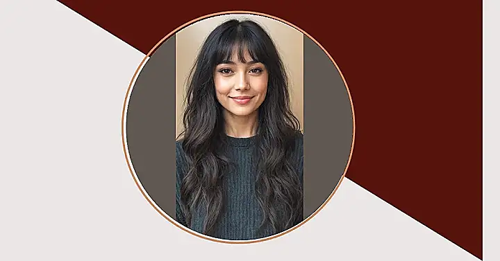Talk about hair goals! The gentle waves and perfectly feathered layers in her long hair just spill down, giving off major “I woke up this fabulous” vibes. Her stylish fringe adds that extra touch of playful charm, framing her warm smile and bright eyes. It’s clear this look isn’t just about having long hair; it’s about that easygoing, breezy movement that makes you want to toss your own hair dramatically, even if you’re just walking to your next class.
