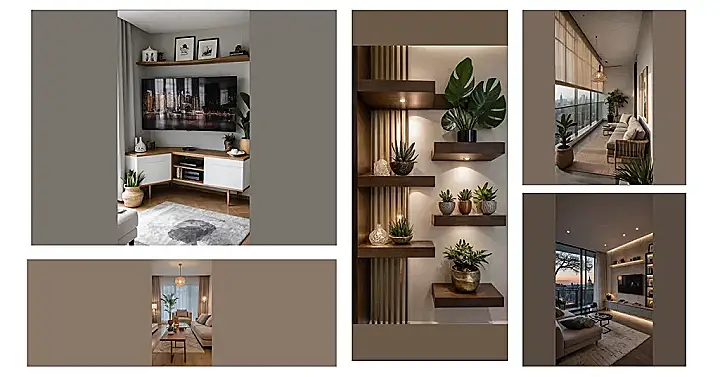Notice how these shelves mix up all sorts of cool stuff – chunky books next to sleek vases, and tiny plants living their best life in snazzy holders? That’s the secret sauce for apartment decorating that looks totally put-together without trying too hard. The warm glow from the candles isn’t just for looking pretty; it makes your entire apartment feel super chill and inviting, like a cozy hug after a long day. So next time you’re thinking your apartment needs a boost, remember these shelves are ready to transform it from ‘just a room’ to ‘wow, this place has serious style!’