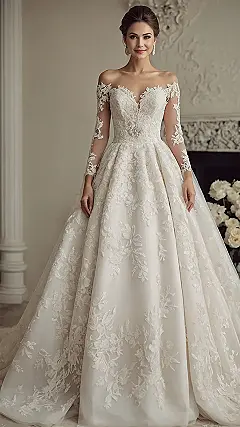 Picking a dress like this means you’re ready for a major moment, a real “wow” factor entrance that makes everyone gasp (in a good way!). The off-the-shoulder look is super elegant, like you just effortlessly draped perfection around yourself. It’s the kind of gown that feels special and oh-so-romantic, perfect for a big day where you just want to feel absolutely gorgeous and maybe slightly dramatic – because sometimes, a little drama is exactly what a romantic story needs!