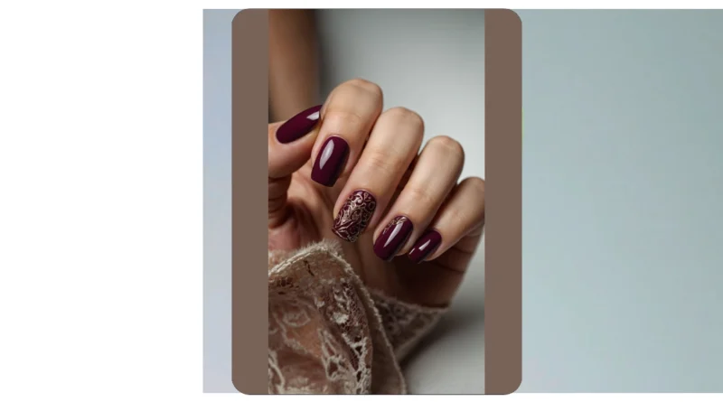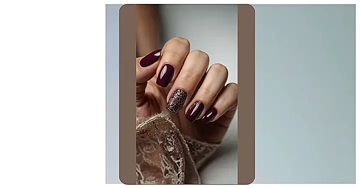 But wait, there’s more than just awesome color! Take a closer look at that ring finger – it’s rocking a fancy gold pattern that looks like it belongs in a royal palace or a super cool vintage movie. It’s like your nails decided to throw a tiny, glamorous party and invited all the bling. Who needs boring nails when you can have this level of fabulousness? These designs are total maroon nails inspo, proving you can be super chic without losing your sense of fun. So go ahead, screenshot this look and prepare for all the compliments – your hands are about to become the main event!