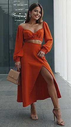 This outfit is the epitome of autumnal chic! The maxi skirt is flowing and fabulous, and the top is just the right amount of crop to show off a little bit of skin without going overboard. You can totally picture this look with a cozy sweater and boots when the weather gets colder, but for now, the bright orange color is the perfect way to spice up your fall wardrobe.