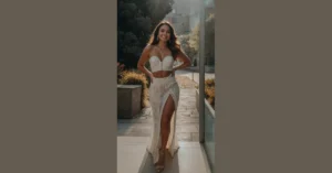 She’s absolutely glowing in this ensemble, holding a bouquet of flowers that looks like it was picked from a secret garden just for her. With that long, dreamy veil flowing behind her, you can tell she’s probably floating on air, or maybe just really focusing on not stepping on the dress. This whole look screams “I woke up like this, flawless, and ready to get married in the most epic way possible!” It’s the kind of sparkly, mermaid-y, boho dream dress that makes you want to throw confetti and maybe even attempt a synchronized swimming routine, just because you feel that fabulous.