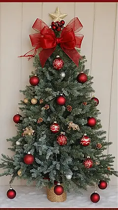 This little Christmas tree looks like it just rolled out of a fancy salon, ready to hit the front porch in style! Decked out in sparkling red and gold ornaments, with a big red bow that probably cost more than my last three streaming subscriptions, it’s basically Instagram-ready for its outdoor debut. You can almost hear it humming carols, hoping for a light dusting of snow to really complete its festive look. Just remember to tell the squirrels it’s not an all-you-can-eat pinecone buffet, no matter how tempting those tiny real ones look!