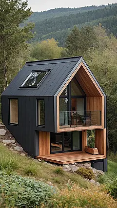 Check out this awesome little micro house tucked away on a hill! It might look small, but it’s packed with style, like a miniature modern castle designed by someone who really loves nature and maybe doesn’t own a million pairs of shoes. Living here would probably mean getting super good at organizing everything you own, kind of like playing Tetris with your stuff, but think of all the extra time you’d have since cleaning would take about five minutes! Plus, that cool black and wood look is way sharper than your average giant brick house.