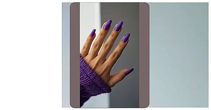 So, check out these nails! They’re like the super extra version of the classic purple. One of them even has a fancy design on it, almost like it’s showing off. Maybe this person is about to ace a test, or maybe they are just trying to look super awesome at the mall. Either way, these nails are ready to party!