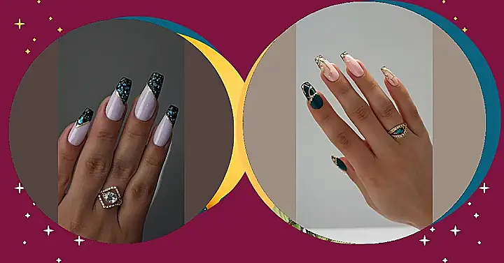 Plus, look at those rings! They’re totally rocking the same color scheme as the nails, making the whole look super coordinated. The mix of gold and purple gems is stunning, and they look so comfy to wear. Seriously considering getting my nails done like this, and maybe even treat myself to a ring or two – I mean, who doesn’t need more sparkle in their life?