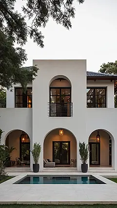 And those arches aren’t just for show – they frame some pretty sweet outdoor living areas, perfect for kicking back with friends or just enjoying the sunset without anyone bothering you. Up top, there’s even a balcony, making you feel like royalty waving to your imaginary fans (or just seeing if the pizza delivery is here yet!). This house screams ‘cool, calm, and collected’ – it’s got that modern, clean look but still feels super welcoming. Honestly, if my house had a pool like that, I’d probably spend more time in the water than in my actual room, perfecting my cannonball technique.