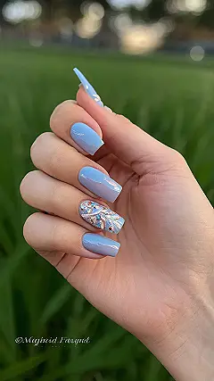 Honestly, trying to choose just one nail design is a major struggle, and this manicure totally understands. You’ve got the classic light blue, a cool geometric design, and that sparkly nail that’s begging to be shown off at the next school dance. Talk about having it all! It’s like a nail buffet – grab a little of everything and prepare to be fabulous!