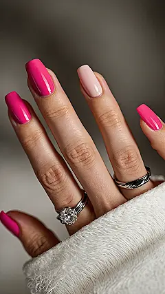 Peep these nails, they’re basically a whole mood board right on one hand! Most fingers are showing off their main character energy with that super vibrant, ‘I’m here to party!’ hot pink. It’s the kind of color that probably whispers sweet nothings about summer vibes and epic selfies. But then, you’ve got that one cool cat of a nail, chilling out with a super soft, almost marshmallow-pink hue. It’s like the quiet genius of the group, still totally stylish but in a super chill way.
