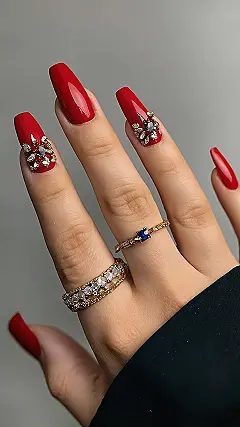 These nails are like the best part of a fall day: warm, cozy, and full of color! That deep red polish is just the thing to make you feel like you’re wrapped up in a comfy sweater on a crisp autumn day. And those diamond rings? They add a touch of sparkle that’s sure to turn heads. Seriously, who needs a pumpkin spice latte when you’ve got these bad boys?