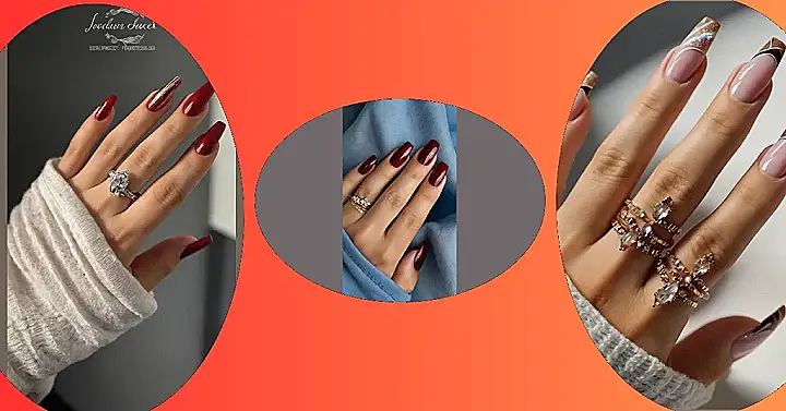 These nails are like the best part of a fall day: warm, cozy, and full of color! That deep red polish is just the thing to make you feel like you’re wrapped up in a comfy sweater on a crisp autumn day. And those diamond rings? They add a touch of sparkle that’s sure to turn heads. Seriously, who needs a pumpkin spice latte when you’ve got these bad boys?
