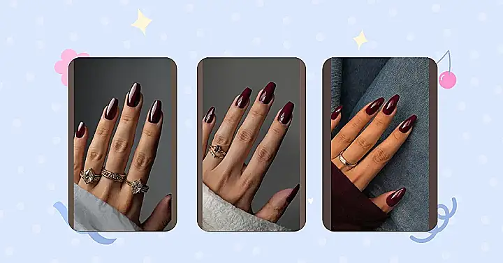 And check out those rings! They’re having a whole sparkle party with these deep red nails. It’s like the nails are the cool, mysterious older sibling and the rings are their dazzling best friends, all hanging out together. This combo isn’t just for fancy events; it’s perfect for making your daily school grind feel a little more glam. Who knew a single shade could make you feel ready to conquer your math test *and* look totally chic while scrolling through your feed? So grab your favorite maroon polish and get ready to add a serious pop of fabulous to your day!