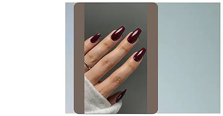 This picture shows some seriously stylish nails, painted in a deep, rich burgundy shade. It’s like the color of a fancy wine you’d sip at a fancy dinner party, but way less messy. You could totally pull off this look, even if you’re just hanging out with your friends at the mall or having a pizza night at home.