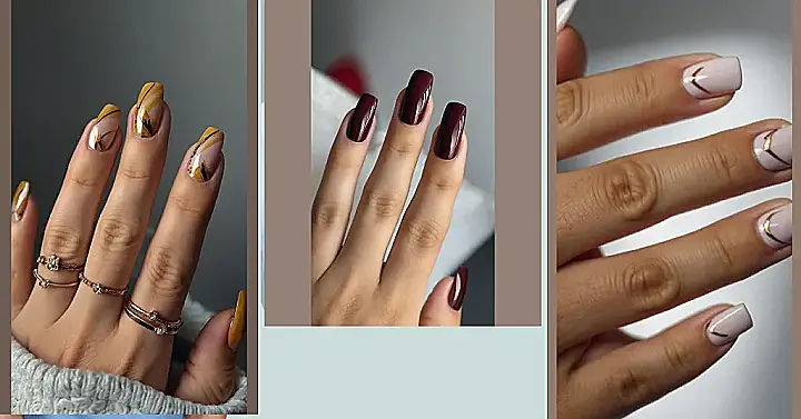 This picture shows some pretty awesome nail paint, right? The dark red on some nails and the sparkly gold on others is super cool. It kinda reminds me of a fancy party outfit – dark and elegant, but with a touch of glitz!