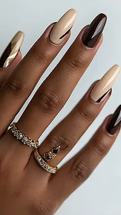 These nails are giving us major fall vibes! They’re like a warm cup of cocoa on a chilly day, or a cozy blanket on a rainy afternoon. The dark brown color is just so rich and elegant, and the nude nails with the little black lines are like a touch of autumn leaves. Plus, that ring with the big sparkly stone is totally rocking! We’re totally digging this look, and we bet you will too!