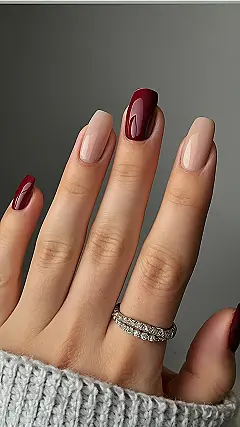 Whoa, these nails are like a super-secret spy mission of sophistication! They’ve got that gorgeous nude shade hanging out with a surprise pop of deep cherry red, making it the perfect manicure for when you want to look put together but also a little mysterious. Imagine showing up to school or a spring picnic with these babies – everyone will be totally jelly!