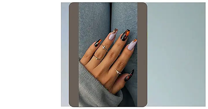 These acrylic nails are totally rocking the “Scorpio” vibe! Imagine being a scorpion – fierce, powerful, and totally ready to own the day. These nails are like a little bit of that scorpion spirit, with the black and orange colors and the edgy, long shape. They’re just begging to be noticed, kind of like you when you walk into a room!