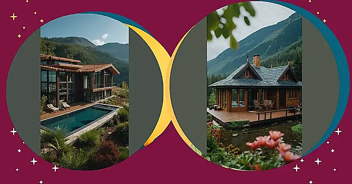 This house looks like a dream come true! It’s nestled in a valley with big, beautiful mountains in the background. The green grass and trees make it feel super peaceful, like you could just relax and forget about all your worries. You can see the house has tons of windows, letting in all that beautiful natural light. It’s like living in a nature scene, but with all the comforts of home.