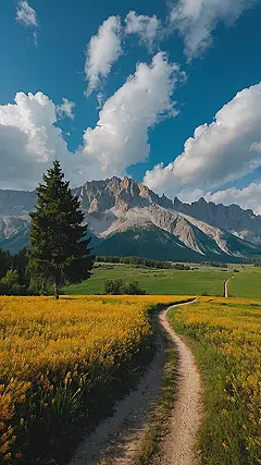 This picture is like a scene straight out of a dream! Imagine strolling down that winding path, surrounded by a sea of sunshine yellow wildflowers. It looks like a super-secret spot that only the lucky few get to discover. The mountains in the background are like giant, friendly giants, keeping watch over everything. Plus, the fluffy white clouds in the sky are like giant marshmallows floating by.