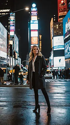 Standing right there in the heart of the madness, surrounded by honking horns and more screens than a tech convention, you’re really trying to bottle up that specific feeling of being *right there* with your camera. This is the magic of New York photography – it’s not just clicking a button; it’s capturing the city’s personality, which is basically a hyperactive squirrel on espresso. You might feel like you’re in a game of Frogger trying to cross the street for the shot, just like our friend in the photo looks ready for anything in their half-and-half coat, probably wondering if that taxi driver is *ever* going to let them finish their pose. Every picture taken here feels like it comes with a tiny bit of the city’s famous hustle baked right in.