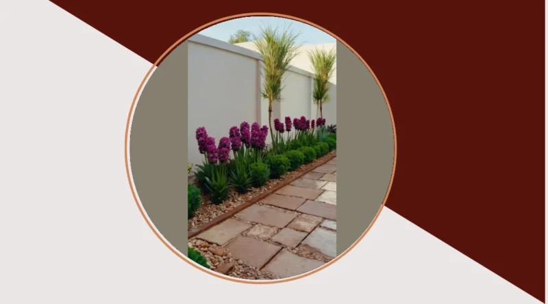 This picture is like a scene from a fairytale! Imagine a gorgeous, sun-drenched garden with a path made of big, flat stones that look like they’ve been there for ages. It’s a peaceful place to walk, just you and the sound of the birds singing. On either side, there’s a row of beautiful purple flowers that are so bright they almost look like they’re glowing. They’re like tiny purple fireworks bursting all over the place!