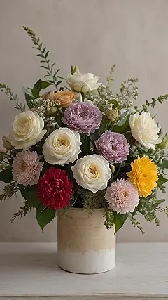 Forget trying to figure out your crush’s texting habits; the real mystery is how someone made this flower arrangement look so effortlessly gorgeous! This isn’t just a handful of blossoms tossed in water; it’s a vibrant convention of petals, with creamy white roses mingling with sassy purple blooms and a bold splash of yellow, all perfectly positioned. It’s like each flower got a secret memo to “look fabulous and stand tall,” and they totally aced it, probably after a quick pep talk from the fern leaves acting as their backstage crew.