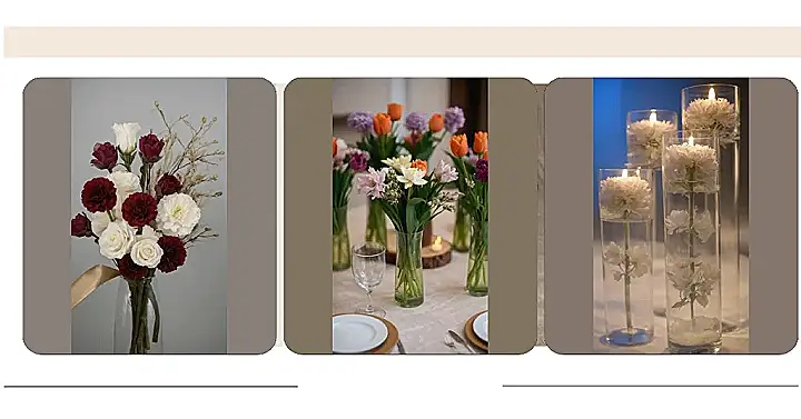 Check out these flower arrangements! They’re basically having a luxurious spa day, floating around in their own private glass towers, complete with tiny, glowing candle hats. Who knew flowers could be so fancy? It’s like they decided a regular vase was too old-school and demanded an upgrade, opting for a glamorous water ballet performance instead. These aren’t just flowers chilling; they’re flowers making a statement, turning any table into a dazzling display where even the petals get to party under their own personal spotlight.