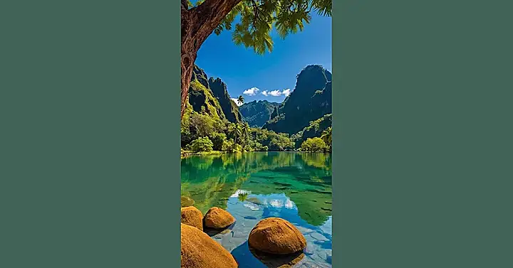 Looking at this photo, it’s like nature decided to create its own little amusement park. The mountains are the rollercoasters, the water is the lazy river, and the trees are, well, the trees, providing all the awesome shade. It’s so perfect it almost looks fake. Maybe someone just got really good at using filters, but either way, it’s a pretty sweet spot for a summer hang!