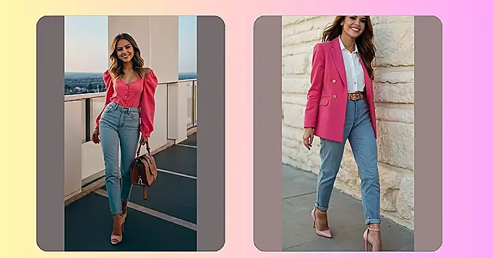 So, you wanna rock pink? This outfit is like a masterclass in how to pull off the “I didn’t try too hard, but I look amazing” vibe. It’s all about balancing the fun, flirty pink blazer with some cool, classic blue jeans. Think of it as a power move—you’re showing that you can be both professional *and* totally fun at the same time. This would be awesome for a party to impress your friends with an innovative and unique style.