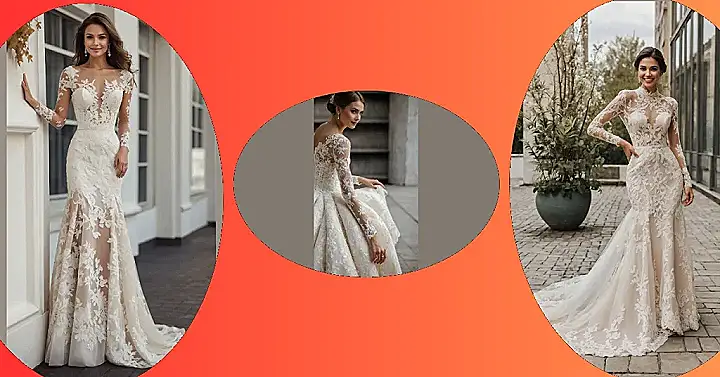 Get ready to swoon over this absolutely stunning ivory wedding dress! This gown is basically a masterpiece of lace, from the long sleeves and high neck all the way down the mermaid-style skirt. There’s so much intricate lace happening, you’d think a team of tiny, super-skilled fashion elves worked overtime just for this occasion. And check out that gorgeous train – it’s like a personal, lacy red carpet that sweeps along behind her, probably making sure no speck of dust dares to mess with her big day.