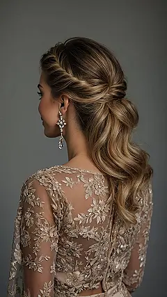 Check out that hair in the photo! It’s got those perfect waves flowing down, giving it that super glam feel, and then bam – the top is pulled back with a cute little braid detail. It’s like your hair is ready for business (looking stunning) and also ready to party (staying put!). This style keeps things neat up top so you can show off your face and maybe some sparkly earrings, while the bottom half is free to bounce along to all your favorite songs. Plus, it makes you look effortlessly put together, which is basically prom goal number one.