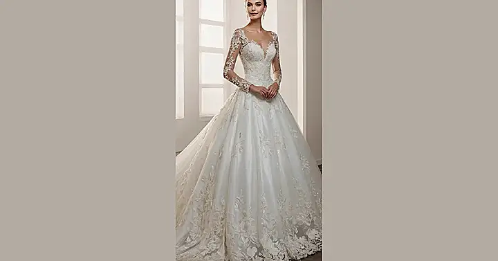Wearing this gown, you’d feel like you just stepped out of a fairytale, but with way more sparkles and definitely better earrings. It’s got that classic long-sleeve, off-the-shoulder vibe that’s super elegant, but still looks comfy enough to bust a move when the DJ drops your favorite song. The only challenge? Trying to sneak a snack before the ceremony without getting crumbs on all that gorgeous beading! Good luck holding that bouquet and a slice of pizza at the same time – though, let’s be real, a dress this fabulous deserves all the attention, not just from the future spouse, but from everyone wondering if it’s magically enchanted.