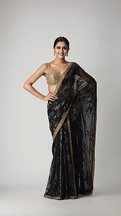 This entire look is basically saying, “I woke up like this, fabulous!” with a wink. The intricate gold work on the black saree, matched with that eye-catching saree blouse, creates a vibe that’s both classy and super fun. It’s the kind of outfit that makes you want to confidently walk into a room and maybe even bust out a few dance moves (carefully, of course, no tripping on the saree!). This combo isn’t just clothes; it’s a full mood, proving that the right saree blouse can make you feel like the main character in your own fabulous story, ready for anything, even if it’s just impressing your aunties!