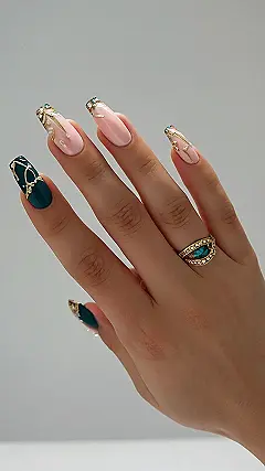 Wow, check out these nails! They’re like a super fancy party on your fingertips. Imagine getting these done for a New Year’s Eve bash in January 2025! That gorgeous mix of sparkly gold and deep green is totally on-trend, and the little jewels add a touch of extra sparkle that’s perfect for celebrating. It’s like wearing tiny works of art on your nails—each one unique and super stylish. They’re definitely not your average January nail art!