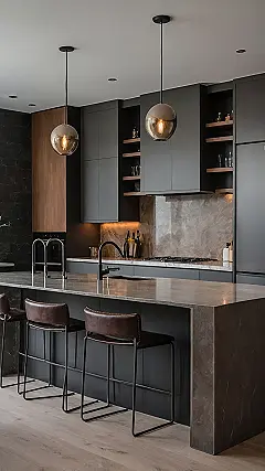 Check out this kitchen, which basically screams ‘I’m way too cool for your instant noodles!’ With those slick dark cabinets and countertops, plus the super futuristic orb lights hanging over the island, you almost expect a robot butler to pop out and offer you a gourmet snack. This isn’t just a place to cook; it’s where your burnt toast would feel incredibly embarrassed. You’d probably feel like you need a secret chef’s degree just to open the fridge, or at least remember to use a coaster for your juice.
