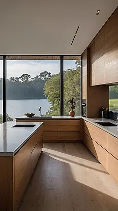You know how sometimes doing the dishes feels like the world’s most boring chore? Well, whoever got this kitchen remodel clearly said, “Not today, dullness!” Look at this place! With those huge windows looking out onto a perfectly calm lake and lush green trees, you’d probably forget you were even scrubbing last night’s pasta pot. It’s like they built a kitchen inside a postcard, making even the most annoying tasks feel like a mini-vacation. Forget scrolling on your phone, this view is the ultimate distraction while you wait for your pizza rolls to cook.