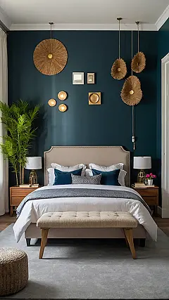 Imagine waking up in this room! With those cool blue walls and straw-like decorations, it’s like you’re in a super fancy underwater hideout. Forget boring beige, this bedroom has major chill vibes and that big leafy plant is probably the only one of your parents’ plants you won’t accidentally kill. I can just picture myself waking up super refreshed in here, ready to actually do my homework (maybe)!