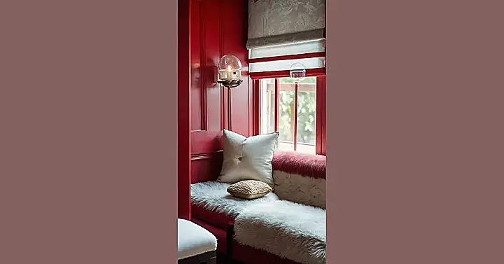 Imagine sinking into a fluffy white sheepskin rug nestled on a vibrant red window seat, the perfect spot for a cozy afternoon read. The red walls, like a warm hug, surround you while the soft light from a whimsical glass lamp casts a gentle glow. It’s like stepping into a fairytale, but with way more comfy pillows! You could easily spend hours in this gorgeous red room, dreaming up adventures or simply relaxing with a good book. Seriously, this space is pure chill vibes.