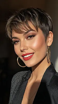 This style isn’t just about looking good; it’s about feeling unstoppable, just like our model rocking those bold red lips and golden earrings! A bixie cut helps your awesome face take center stage, letting your personality truly shine. It’s perfect for those days when you want to feel totally put-together but have zero patience for complicated hair routines. Whether you’re aiming for a super chic vibe or a playfully edgy look, this cut is like your personal style cheerleader, ready to make every hair flip (even a short one!) feel epic. Get ready for compliments, because this cut is pure confidence in hair form!