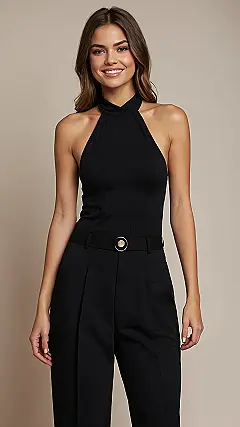 Now, don’t just stop at the top! This outfit really comes alive when you pair that fab halter with some sharp black trousers and a cool belt that ties it all together with a little pop of gold. It’s like the outfit secretly has a superpower: making you look totally put-together for school presentations *and* ready for a spontaneous concert. This combo is the ultimate proof that you can look super stylish and still be comfy enough to do anything. This halter top ensemble is basically telling your wardrobe, ‘Move over, plain old T-shirt, there’s a new cool kid in town!’ It’s the kind of outfit that makes you feel ready to tackle the world, one stylish step at a time.