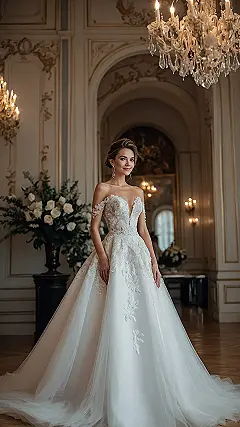 Look at this wedding dress! It’s got more lace than a fancy doily shop and a skirt so flowy you could probably hide a small pony underneath (don’t try that at home). This kind of vibe, sometimes called ‘rococo,’ is all about looking super elegant and maybe just a *tiny* bit over-the-top in the best way possible. Think fancy party, but like, for your whole life starting now. The off-the-shoulder sleeves and delicate lace give it that “I’m a fancy princess but also totally chill” look that probably makes walking down the aisle feel like gliding.