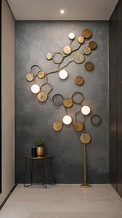 Look at this wall! It’s like someone took a bunch of shiny gold coins and some super cool lightbulbs, then played a sophisticated game of connect-the-dots to create this amazing artwork. This isn’t just a lamp; it’s a show-stopping piece of room decor that practically screams, “I’m here to make things sparkle!” If your room’s vibe is currently ‘just a wall,’ adding one of these dazzling elements instantly elevates it to ‘wow, that’s awesome!’ status. It’s the kind of piece that makes you feel like you’ve got your own personal art installation, only way more functional because, you know, light.
