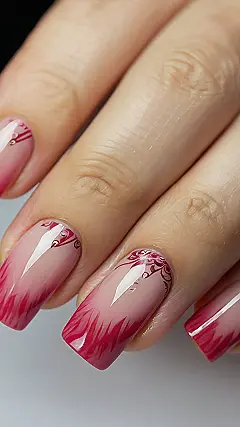 These rose pink nails are giving off some serious “fancy but fun” vibes! Some nails are rocking that solid rose pink, like a perfectly ripe raspberry, while others have a softer, blush pink base with artsy red streaks that look like someone spilled a fancy drink and turned it into nail art. It’s like the best of both worlds: classy and ready to party.