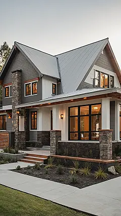 Check out this house! It looks like it was designed by someone who really loves their job, because every detail, from those cool exposed wood beams on the porch to the neat gabled roofs, just screams ‘I’m awesome!’ You can almost feel the solid vibe of this Craftsman house, like it’s saying, ‘Come on in, I’ve got enough sturdy charm to handle anything – even your little brother’s loudest video game session.’ The grey siding and crisp white trim give it that classic, timeless look, and that inviting stone pathway practically rolls out the welcome mat, making you want to grab a lemonade and chill on the porch.