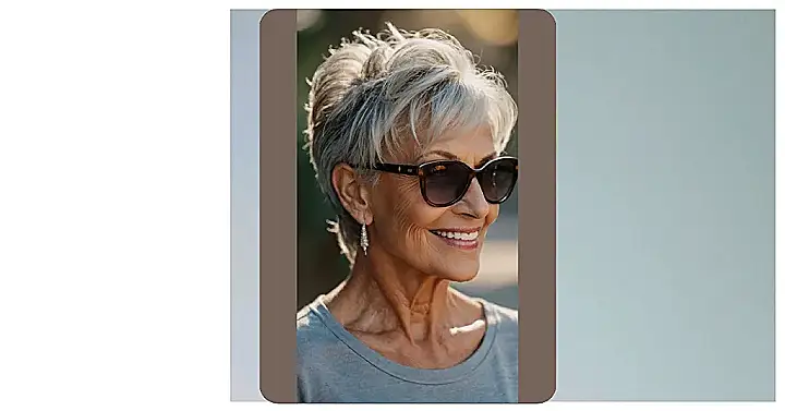 This woman is rocking a hairstyle that screams “I’m confident and I know it!” Her short, choppy haircut is super stylish and shows off her gorgeous grey hair. It’s like she’s saying, “I’m not afraid to embrace my age and look amazing doing it.” And those sunglasses? They’re just the cherry on top of this fabulous look. She’s a total rockstar, even if she is rocking grandma chic!