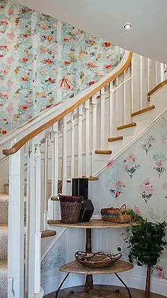 That wallpaper pattern is so cool; it’s like a secret code made of leaves and flowers. I bet if you stare at it long enough, you’ll start seeing hidden staircases to even cooler rooms! Or maybe that’s just me projecting because I really like the cool mix of the wood stairs and the leafy wallpaper.