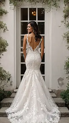 And that back? Wowza! The intricate lace pattern forms a gorgeous V-shape, showing off just the right amount of skin and making it totally unforgettable from every angle. She looks so happy and confident, probably thinking about how amazing she feels or maybe even planning her epic dance moves (let’s hope the trumpet skirt is good for busting a move!). Whether she’s walking down the aisle or just posing like a superstar, this dress definitely proves that some outfits are just made to be talked about, long after the confetti settles.