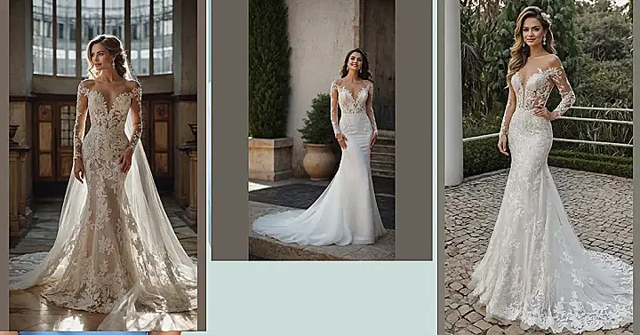 Get a load of this wedding dress! It’s got that famous “trumpet” shape, which basically means it’s super fitted until about the knee, and then BAM – it flares out dramatically like the bell of a trumpet. This style is definitely for someone who wants to make a grand entrance, maybe even requiring a red carpet and a slow-motion walk, because you’re practically floating on air. With those delicate lace sleeves and the way the silky fabric catches the light, it looks like this bride could easily be off to star in her own rom-com or, at the very least, command attention at the snack table.