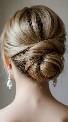Seriously though, that bun is amazing. It’s all perfectly twisted and sculpted, like a piece of art you’d find in a fancy museum (but way more fun!). It’s the perfect blend of classic and contemporary—like that one song everyone loves to dance to at a wedding. It’s also super practical; you can dance the night away without a single hair falling out of place. Plus, it leaves your stunning earrings perfectly on display! Now that’s what I call a win-win!